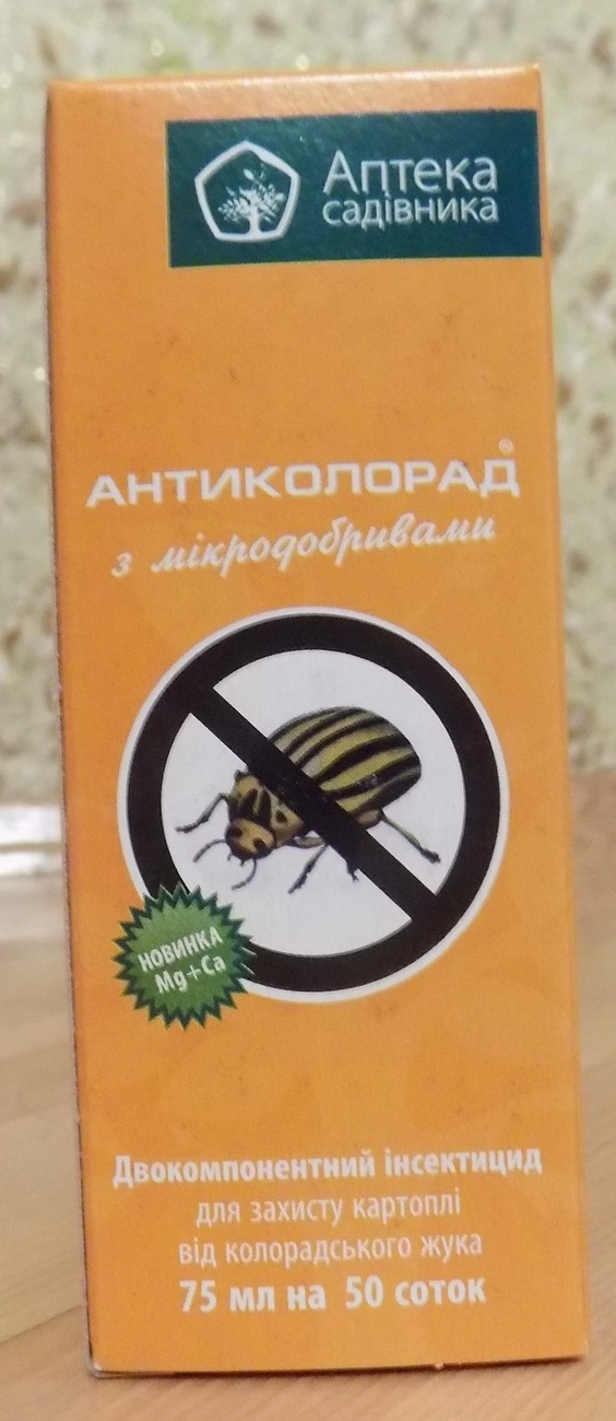 Двухкомпонентный инсектицид Антиколорад 75 мл – препарат смешанного действия, который применяется для защиты картофеля и других культур от колорадского жука и некоторых других вредителей. Обработку препаратом растений проводят в период вегетации. Обработку фруктовых деревьев проводят до и после цветения. Инсектицид Антиколорад 75 мл мы предлагаем купить по самой низкой цене в Украине с доставкой в любой населенный пункт. Преимущества инсектицида. Эффективная защита культур от колорадского жука, плодожорки, долгоносиков и других насекомых. Препарат не вызывает привыкания у насекомых. Защитный период действует долгое время. Препарат эффективно уничтожает как личинки, так и взрослых вредителей. Гибель насекомых происходит через несколько минут. Препарат безвреден для растения. Антиколорад инструкция по применению. Для обработки 1 сотки картофеля либо сахарной свеклы необходимо сделать рабочий раствор из 1.5 мл препарата разведенного в 5 литрах воды. Для обработки 1 сотки участка с томатами, огурцами, баклажанами, кустами роз необходимо сделать раствор из 1 мл препарата разведенного в 5 литрах воды. Для обработки фруктовых деревьев готовится раствор из 3 мл препарата и 5 литров воды. Для обработки 1 сотки участков гороха и пшеницы используют рабочий раствор из 1.5 мл препарата и 5 литров воды. Для освобождения участков от саранчи используют раствор 1.5 мл средства, разведенные в 5 литрах воды. Культура Спектр действия Норма расхода препарата Способ, время обработки Срок ожидания, суток Картофель Колорадский жук, тля, картофельная моль, совки, трипсы, клопы 1,5 мл на 3-5 л воды на 1 сотку Опрыскивание в период вегетации при появлении вредителей 20 Плодовые в т.ч. яблоня, груша Почечный долгоносик, яблоневый цветоед, букарка, казарка, яблоневый пилильщик, трипсы, тля, грушевый клоп, отдельные виды клещей 3-5 мл на 5-8 л воды на 1 сотку 30 Зерновые колосовые культуры Вредная черепашка, хлебные жуки, трипсы, блошки, цикадки, пиявицы, тли, мухи и другие 3 мл на 3-5 л воды на 1 сотку 20 Кукуруза Стеблевой кукурузный мотылек, западный кукурузный жук, мидляк, чернотелки 2,5 мл на 3-5 л воды на 1 сотку К сведению потребителя. Мировой опыт применения аналогичного препарата: Томаты Колорадский жук, подгрызающие совки, трипсы, тля и другие виды вредителей 1,5 мл на 3-5 л воды на 1 сотку Опрыскивание в период вегетации при появлении вредителей 20 Капуста Билан, медведки, тли, подгрызающие совки, капустная моль, блошки Бобовые Гороховая зерновка, плодожорка, долгоносики, тля, трипсы 1,5 мл на 3-5 л воды на 1 сотку 14 Свеклу Свекольные долгоносики, блошки, щитоноски, тли 1,5 мл на 3-5 л воды на 1 сотку 20 Источник