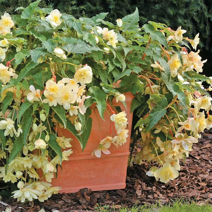 Бегонія Шансон F1 - бульбова ампельна махрова, середньо-росла бегонія. Чудова однорічна рослина з махровими і напівмахровими квітками ванільно-жовтого забарвлення. У рослини зазвичай є 5-8 основних пагонів. В пазухах кожного листа розташовані довгі квітконоси з квітками правильної форми діаметром 6-8 см. Довжина звисаючих пагонів - 30-45 см. Кращий термін посіву насіння - середина грудня - перша декада січня. Сіють їх у неглибокі ящики, наповнені просіяною земляною сумішшю. Рослини утворюють гарний каскад довжиною до 50 см і рясно цвітуть протягом усього сезону культивації. Стійкі до несприятливих умов. Квіти особливо придатні для вирощування у квіткових ящиках, на піднесених місцях і в підвісних горщиках: скрізь, де вигідно проявляється звисаюча форма рослин.
