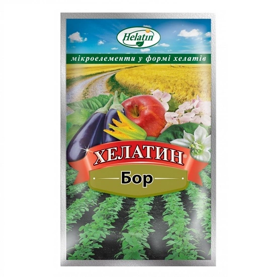 Хелатин Бор ― водорозчинне добриво на основі мікроелемента бор в доступній формі у вигляді хелатів. Призначено для овочевих, ягідних, баштанних, плодових, зернових, технічних, бобових культур, винограду, квітів, декоративних дерев і чагарників. Бор, поряд з основними елементами, відіграє важливу роль в житті рослин, він впливає на розвиток органів плодоношення.