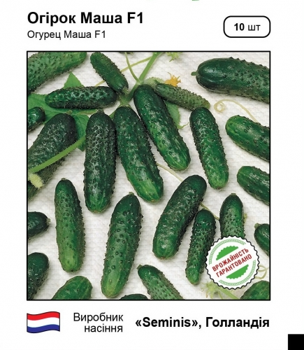 Самий ранній з існуючих гібридів самозапильного огірка-корнішона. Партенокарпік. При достатньому живленні формує по 6 - 7 плодів на кожному вузлі. Плоди довжиною 9-11 см, без гіркоти, дозрівають дуже рано і дружно. Призначені для споживання у свіжому вигляді та переробки. Стійкий до вірусу мозаїки огірка, кладоспоріозу та борошнистої роси, відносно стійкий до несправжньої борошнистої роси. Рекомендується для вирощування в скляних і плівкових теплицях, а також у відкритому грунті вертикальним і горизонтальним способами.