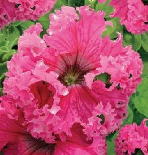 Чарівний великоквітковий гібрид бахромчатої низькорослої петунії. Нарядні великі квіти діаметром 8-10 см з хвилястими, рюшеподобнимі краями рожевого кольору. Прекрасно виглядають в балконних ящиках, контейнерах, садових вазах, окремими ефектними групами в квітниках. Віддає перевагу сонячним, захищеним від вітру ділянкам, регулярному поливу і підгодівлі. Насіння висівають прямо на поверхню грунту, не закладаючи.