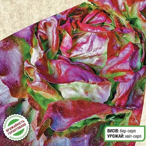 Ранній головчастий маслянийстий салат. Вирощують з ранньої весни до пізнього літа. Головку формує масою до 400 г з красивим, маслянистим листям темно-червоного кольору. Сорт відзначається високою стійкістю до стрілкування, має відмінний смак, багатий вітамінами, мінеральними солями і мікроелементами – просто незамінний на вашому столі!